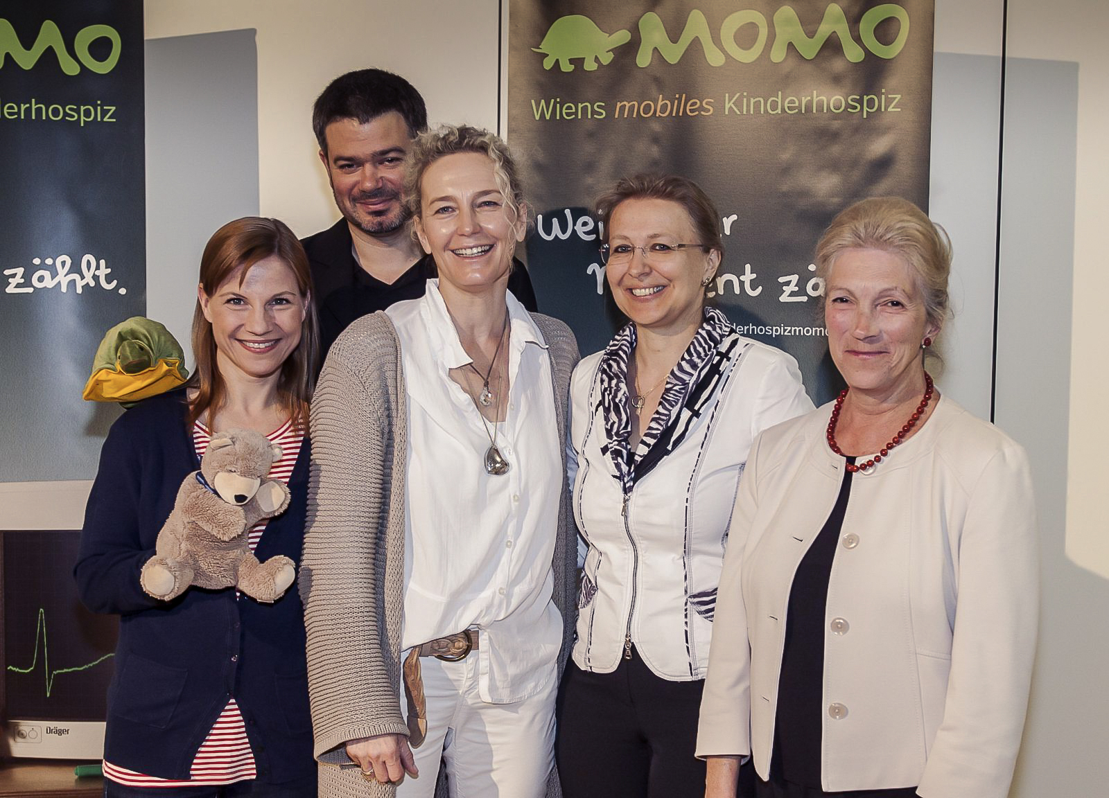Foto: v.l.n.r.: Kristina Sprenger (MOMO-Botschafterin 2014), Bernhard Fellinger (Ö1 Journalist & Moderator), Dr.in Martina Kronberger-Vollnhofer (MOMO-Leiterin & Kinderärztin), Ing. Michaela Pöltl (betroffene Mutter, einer Familie, die von MOMO begleitet wird) und Dr.in Renate Müller (Ehrenamtliche Hospizbegleiterin bei MOMO)
